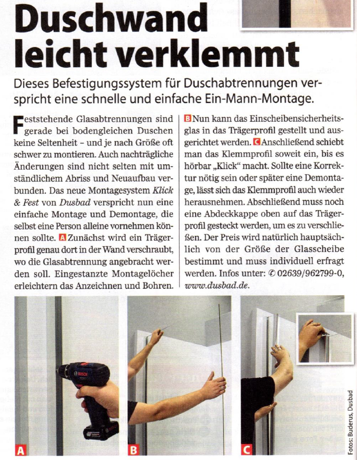 Die renommierte Heimwerkerzeitschrift „Selbst ist der Mann“ empfiehlt den einfachen Selbsteinbau von Duschwänden mit dem Klick & Fest-System von DUSBAD. Wir freuen uns über das Vertrauen der kultigen Do-it-Yourself-Zeitschrift.